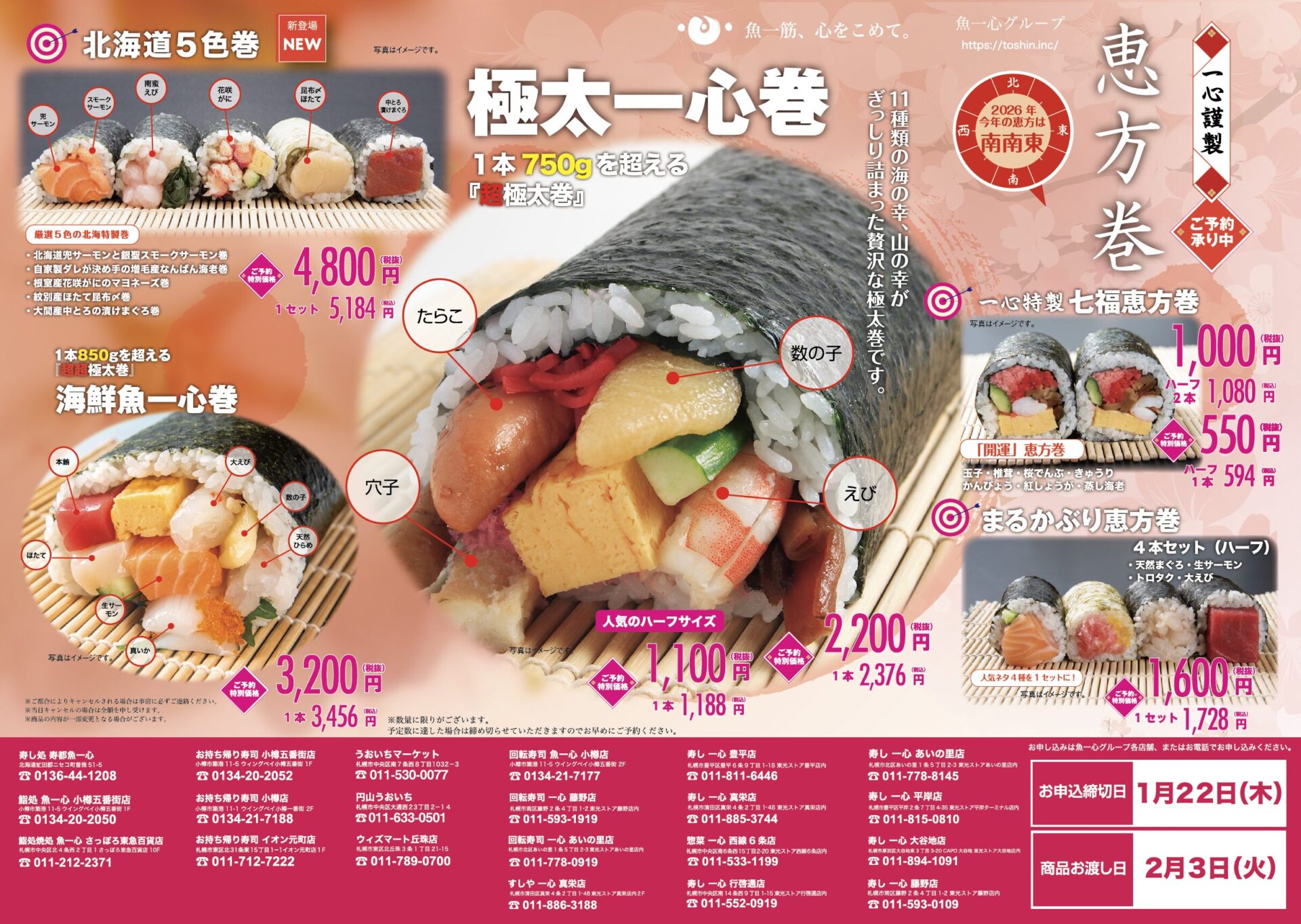 そのほかにも、・極太一心巻・七福恵方巻・まるかぶり恵方巻 など各種恵方巻をご用意しております。
